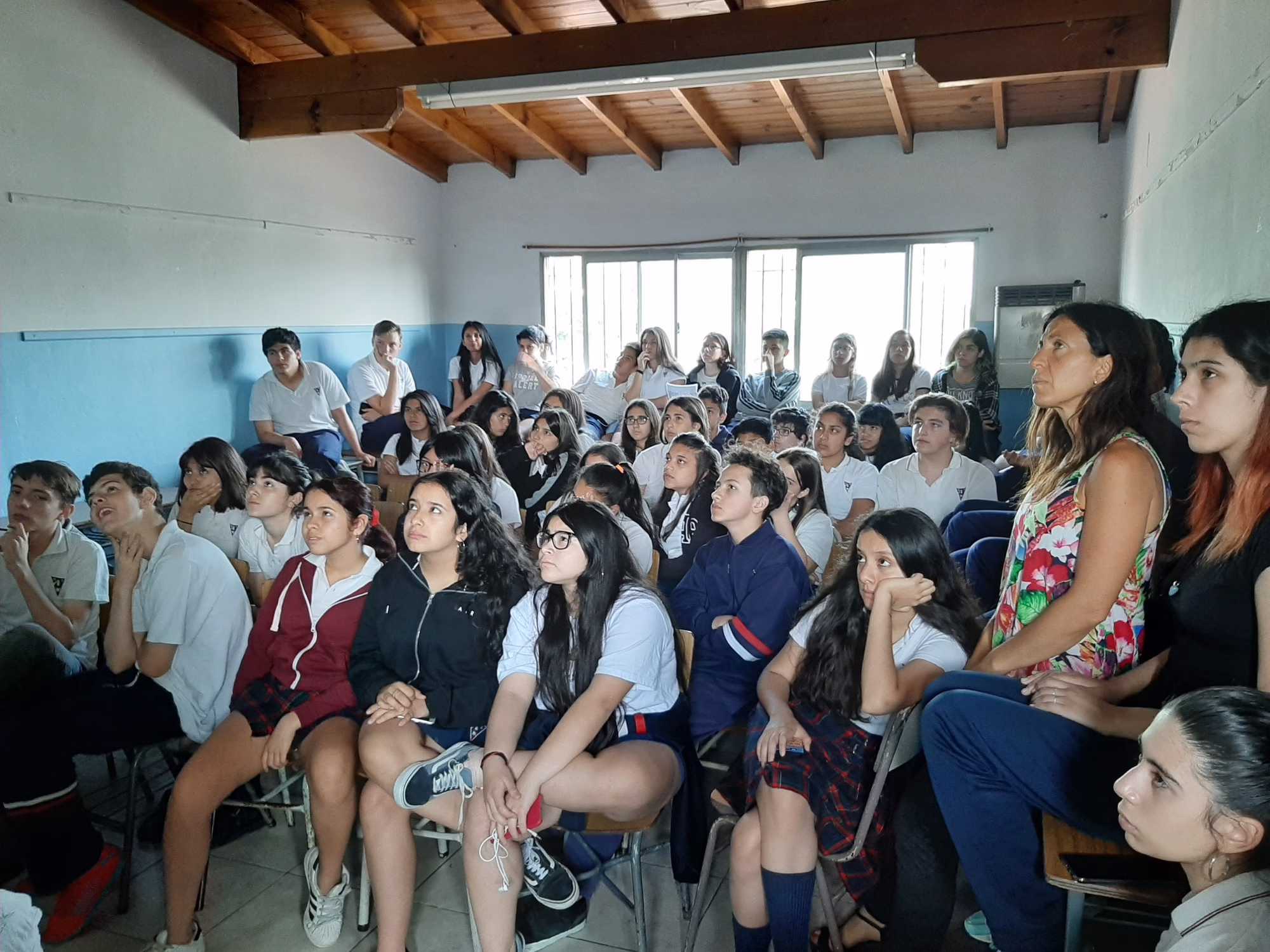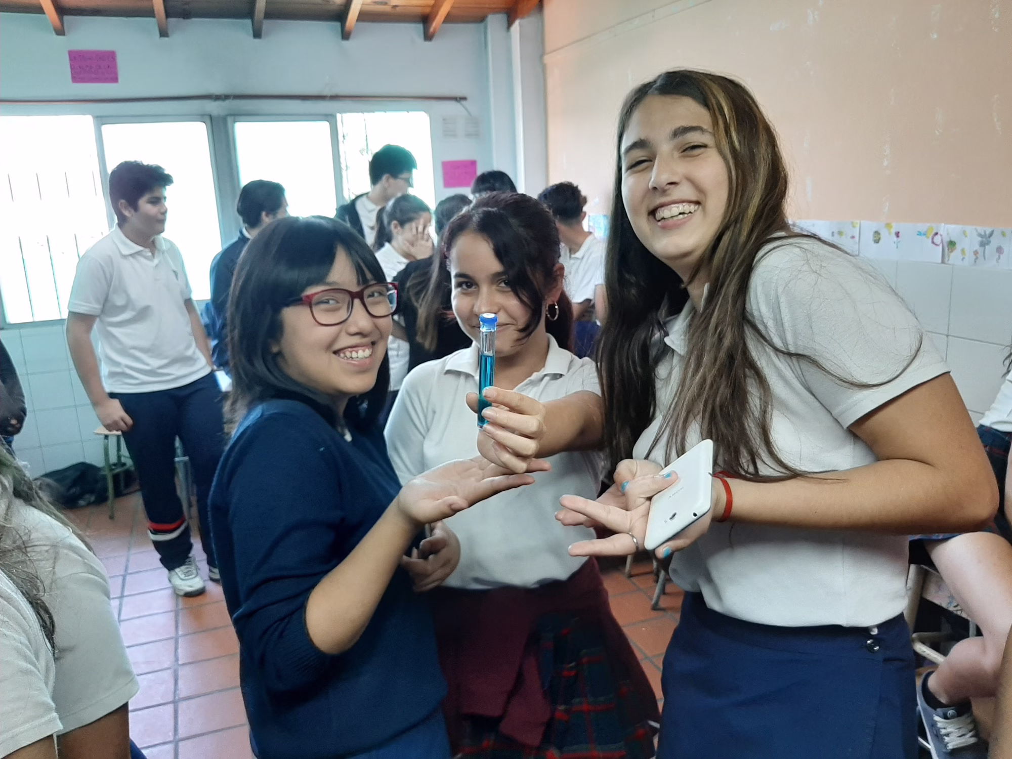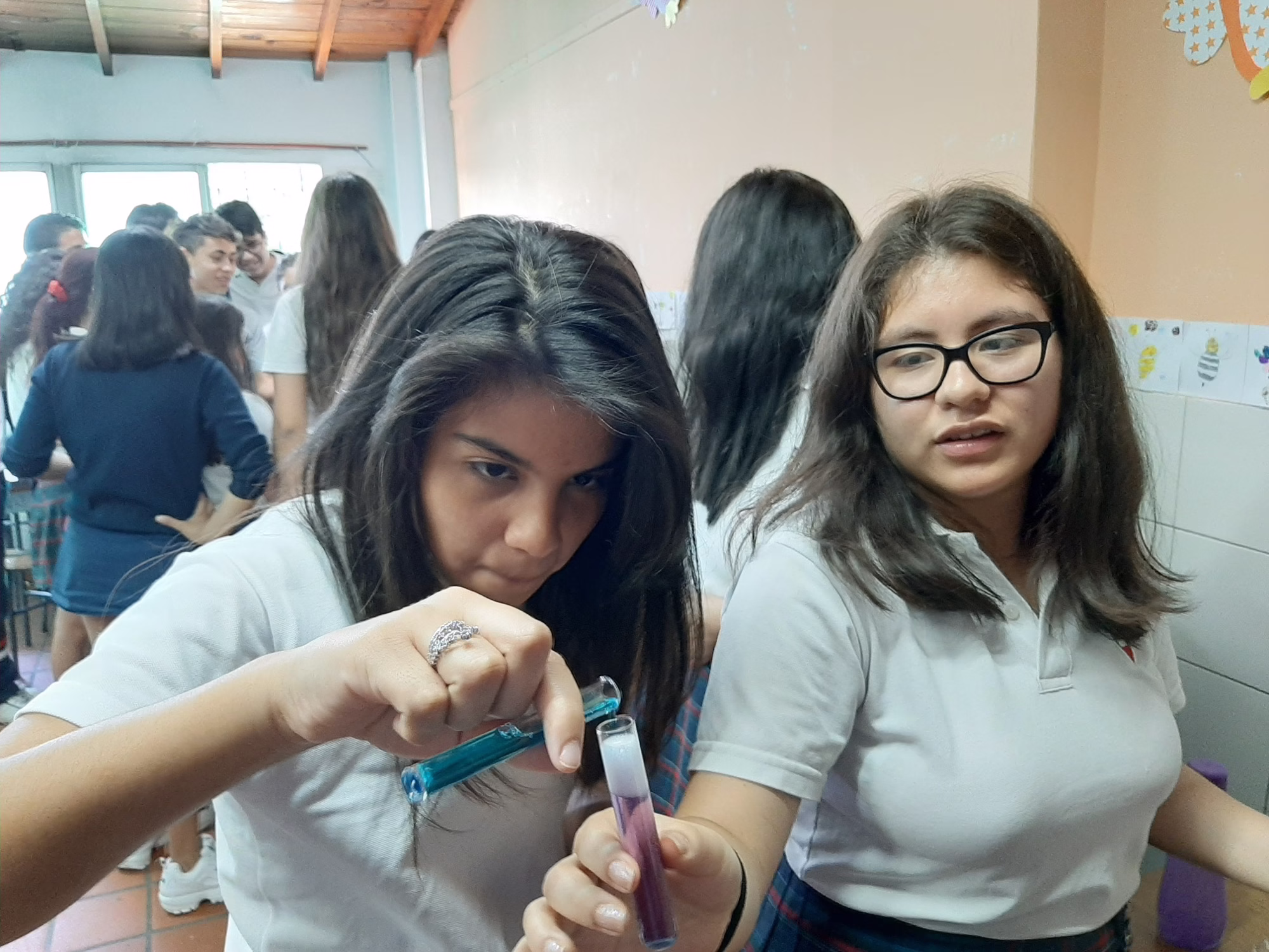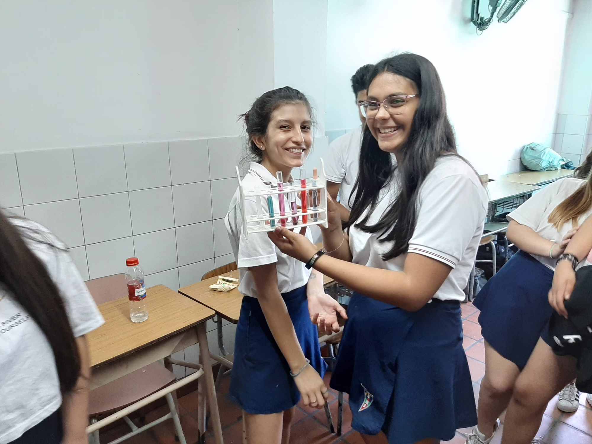 Los alumnos de 3°ESB ofrecieron a sus compañeros de 2°ESB una charla sobre PH (medida que indica la cantidad de iones de hidrógeno en una solución o sustancia), y juntos realizaron experimentos a fin de determinar los niveles de acidez o alcalinidad de diversas sustancias.